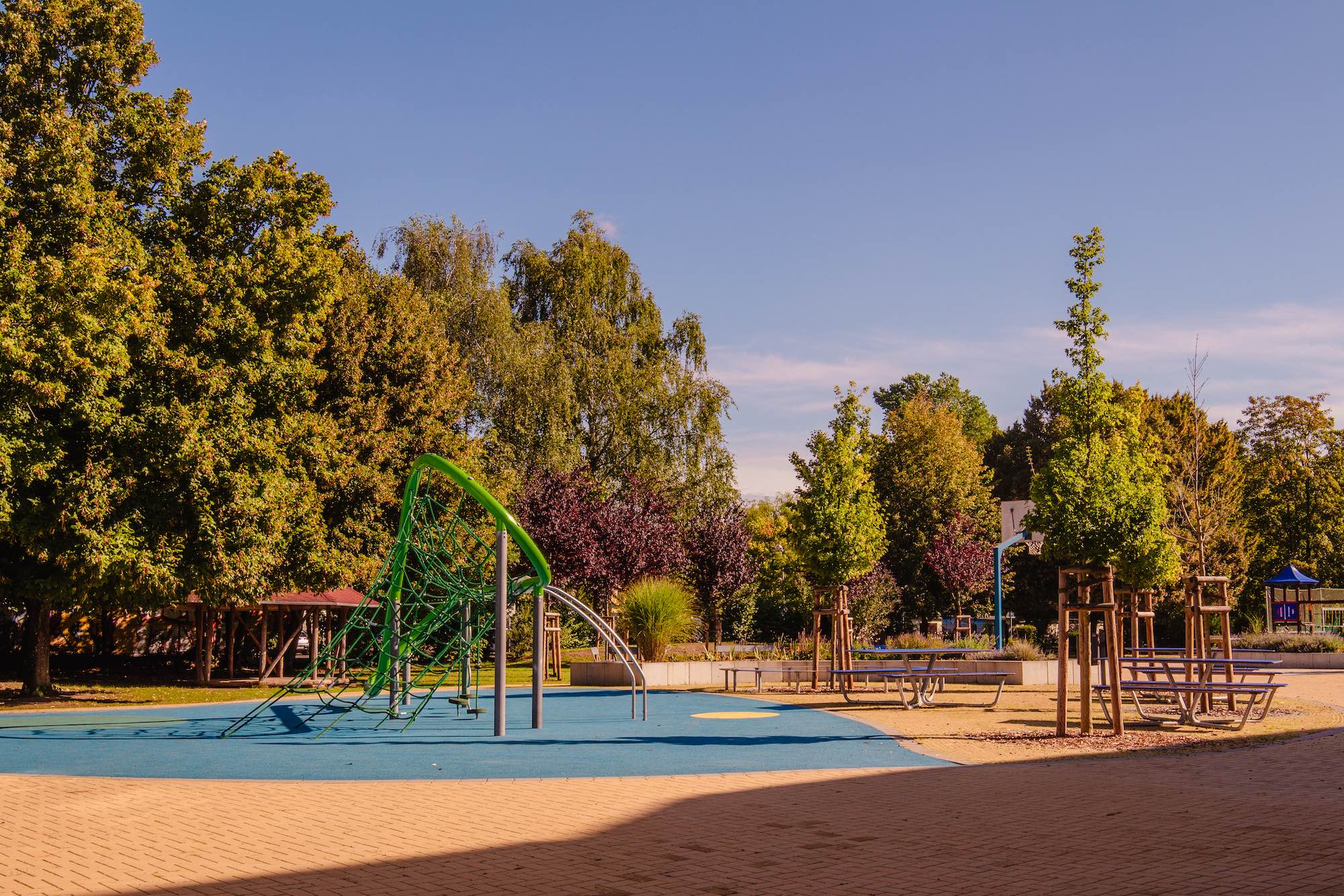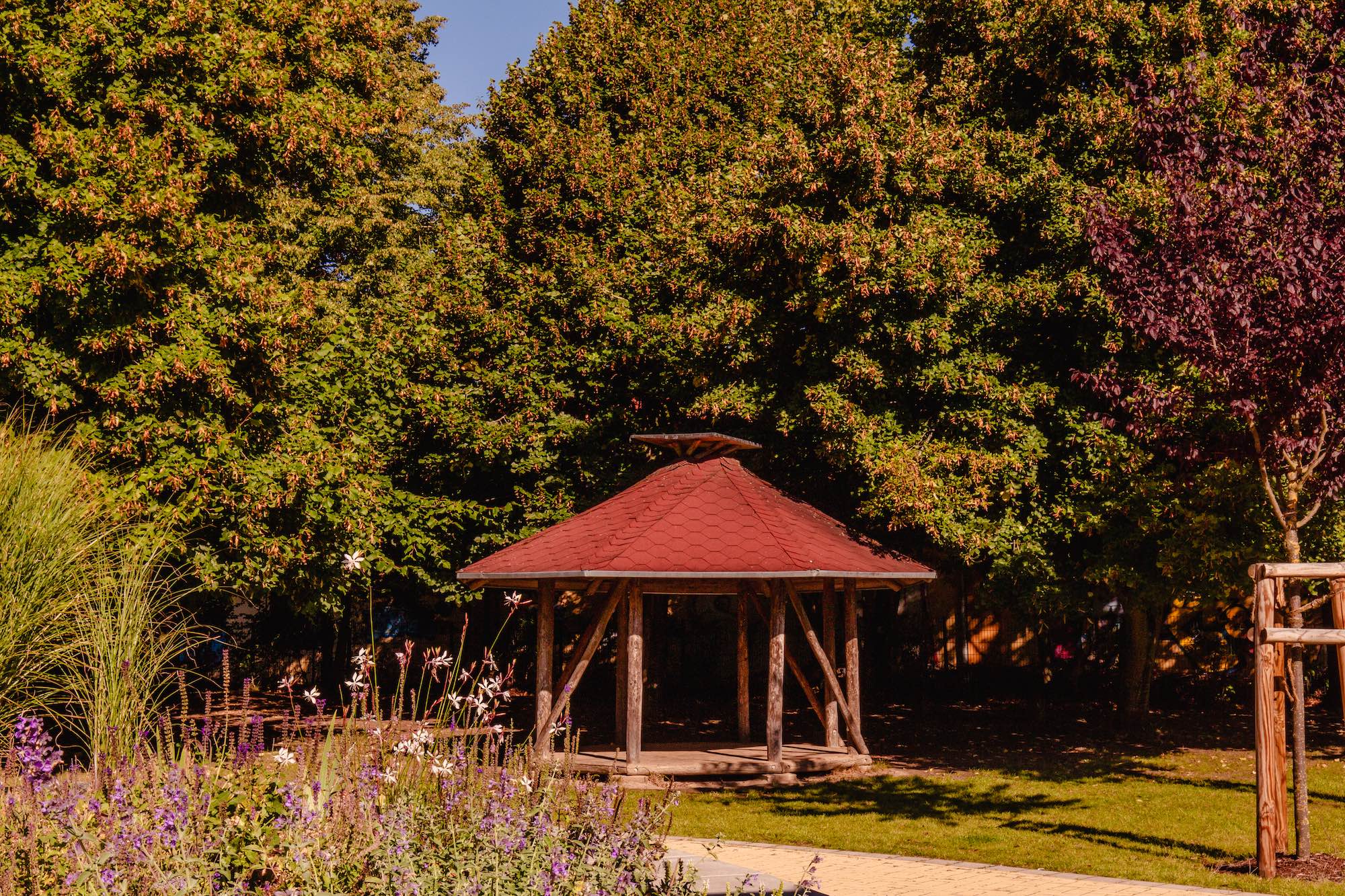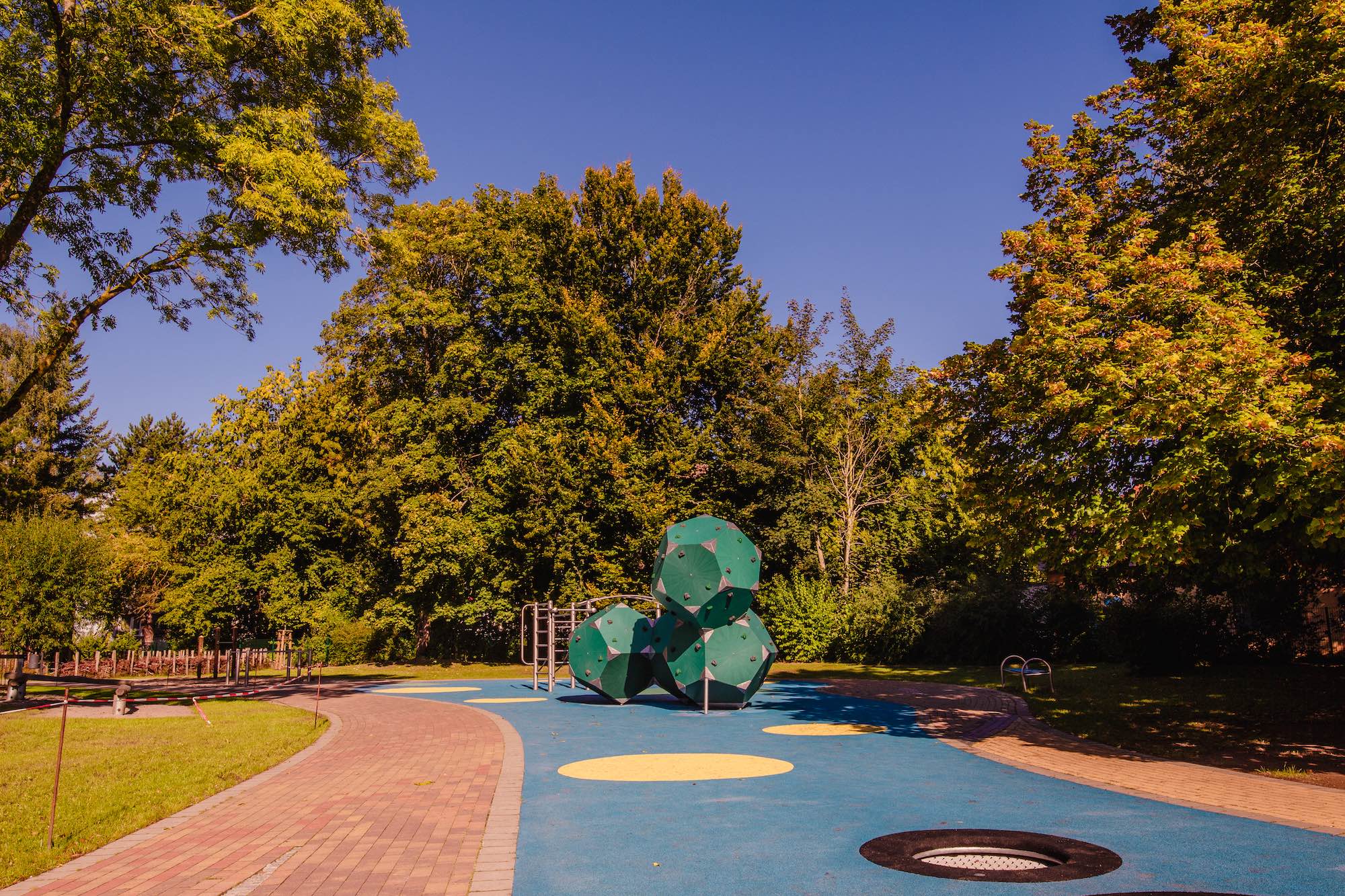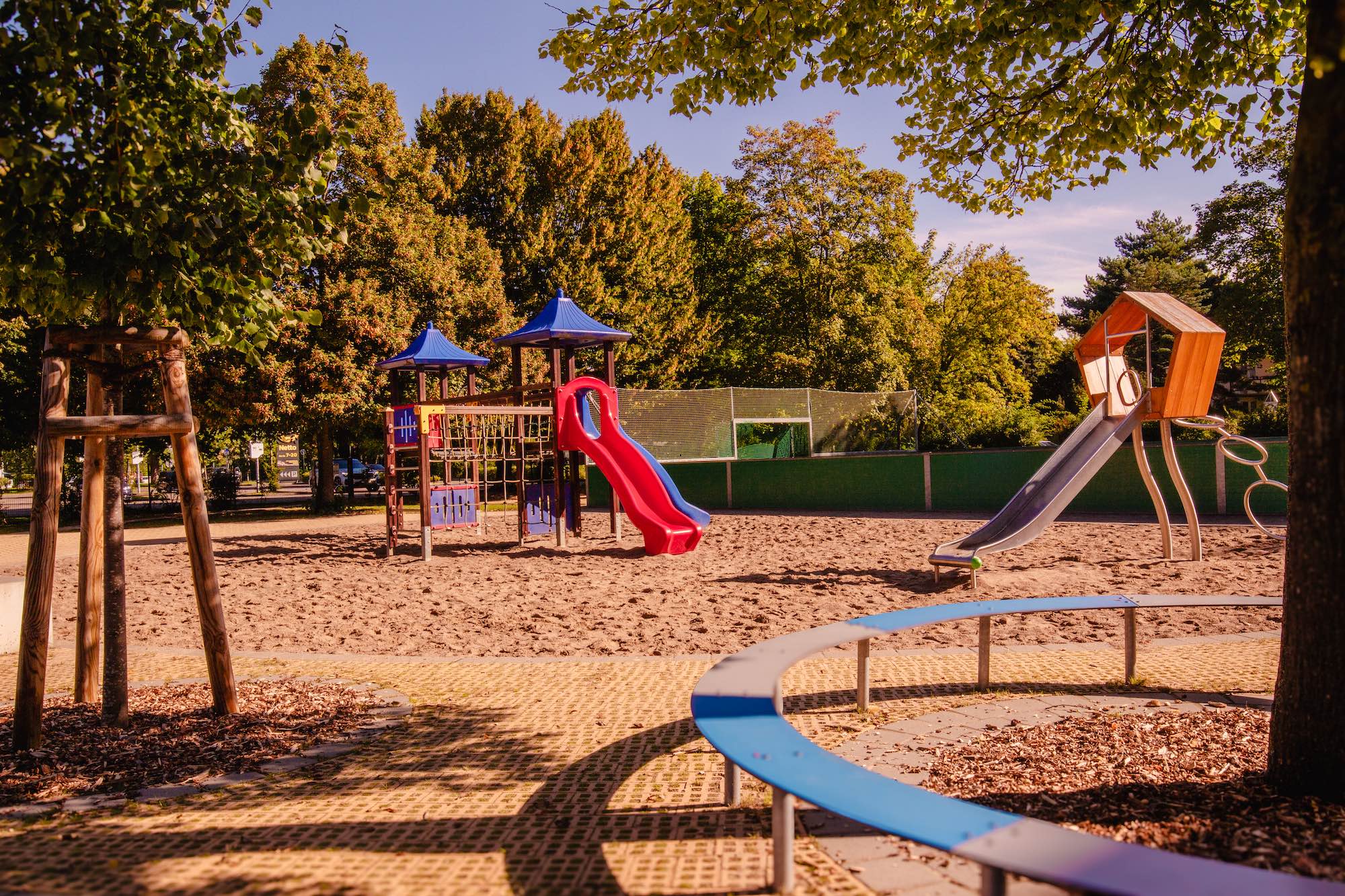 Das großzügige Außengelände ist ebenfalls im Rahmen der Doppelnutzung am Nachmittag für den Hort verfügbar. Ein Fußballplatz, Sandkästen und viele Klettergerüste bieten den Kindern die Möglichkeit ihrem Bewegungsdrang nachzukommen. Viele unterschiedliche Geräte erlauben weitere Anregungen für das kindliche Spiel im Freien. Weiterhin bietet der Außenbereich verschiedenste Sitz- und Rückzugsmöglichkeiten, um den Bedürfnissen der Kinder gerecht zu werden.