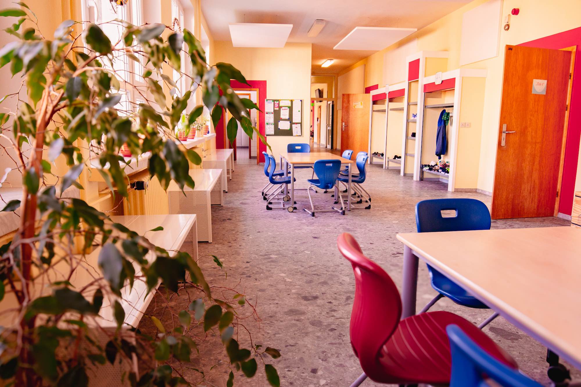 Die Räumlichkeiten werden in Doppelnutzung von Lehrkräften und pädagogischen Fachkräften mit Leben gefüllt. Dies bedeutet, dass im Vormittagsbereich das Lehrpersonal in den Räumen Unterrichtseinheiten, Projekte o.ä. gestalten können. Am Nachmittag steht das Erdgeschoss den Hortkindern und den pädagogischen Fachkräften zur Verfügung.