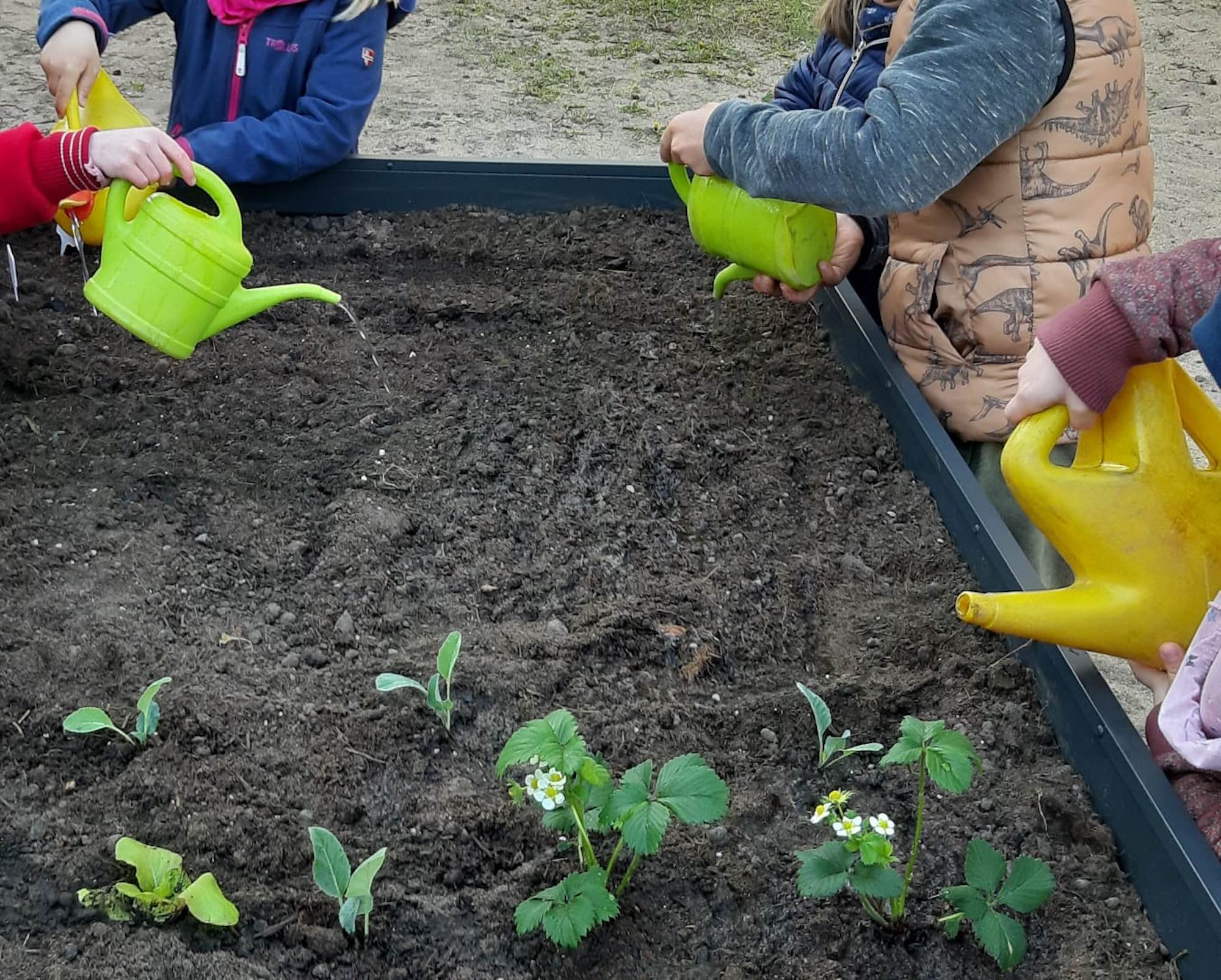 Außerdem nutzen wir seit 2023 zwei Hochbeete auf unserem Gelände. Dort können die Kinder den Pflanzen beim Wachsen zuschauen und bei deren Pflege mithelfen. Unser Koch nutzt dann die geernteten Obst- und Gemüsesorten und integriert sie in den Speiseplan.