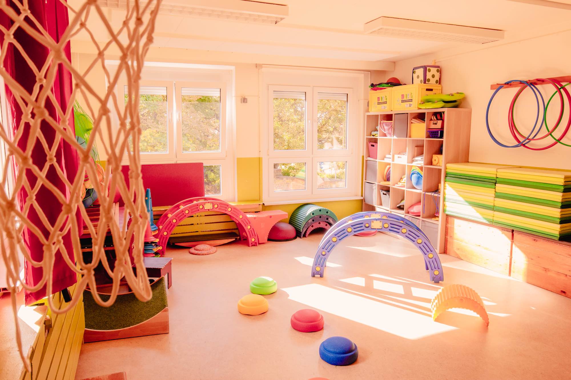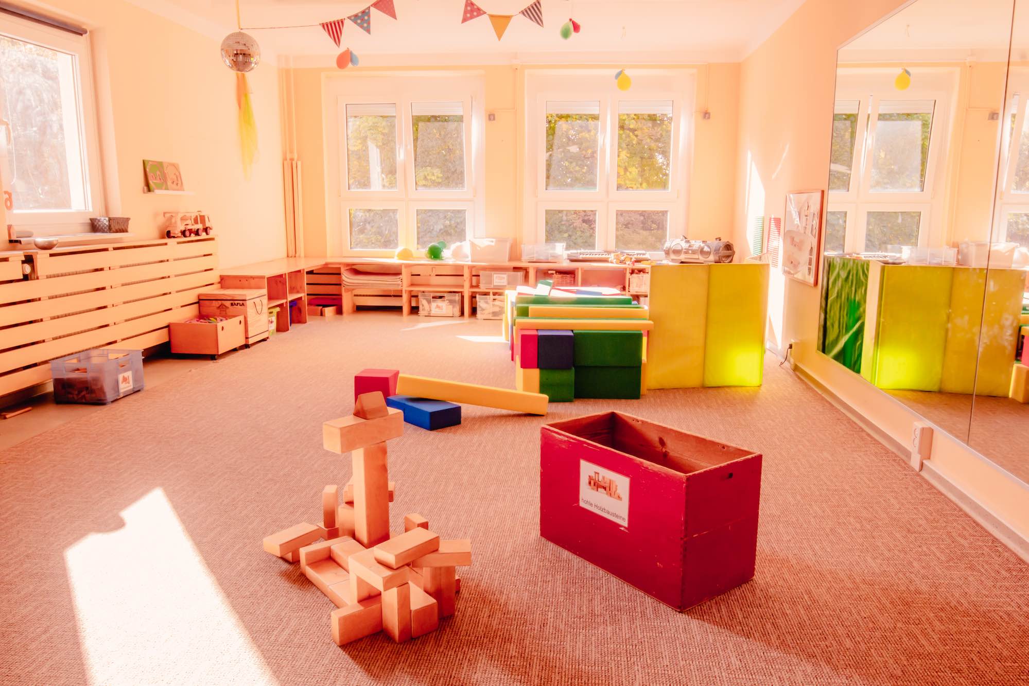 Die Kindergartenkinder nutzen die blaue (1. OG) und die rote Ebene (2. OG) unseres Hauses. Dort stehen ihnen zahlreiche, liebevoll gestaltete und eingerichteten Räume zur Verfügung. Ob Bau-, Kreativ- oder Entspannungsraum, die zahlreichen, abwechslungsreichen Funktionsräume laden zum Verweilen, zur kreativen Entfaltung oder zum Bewegen ein.