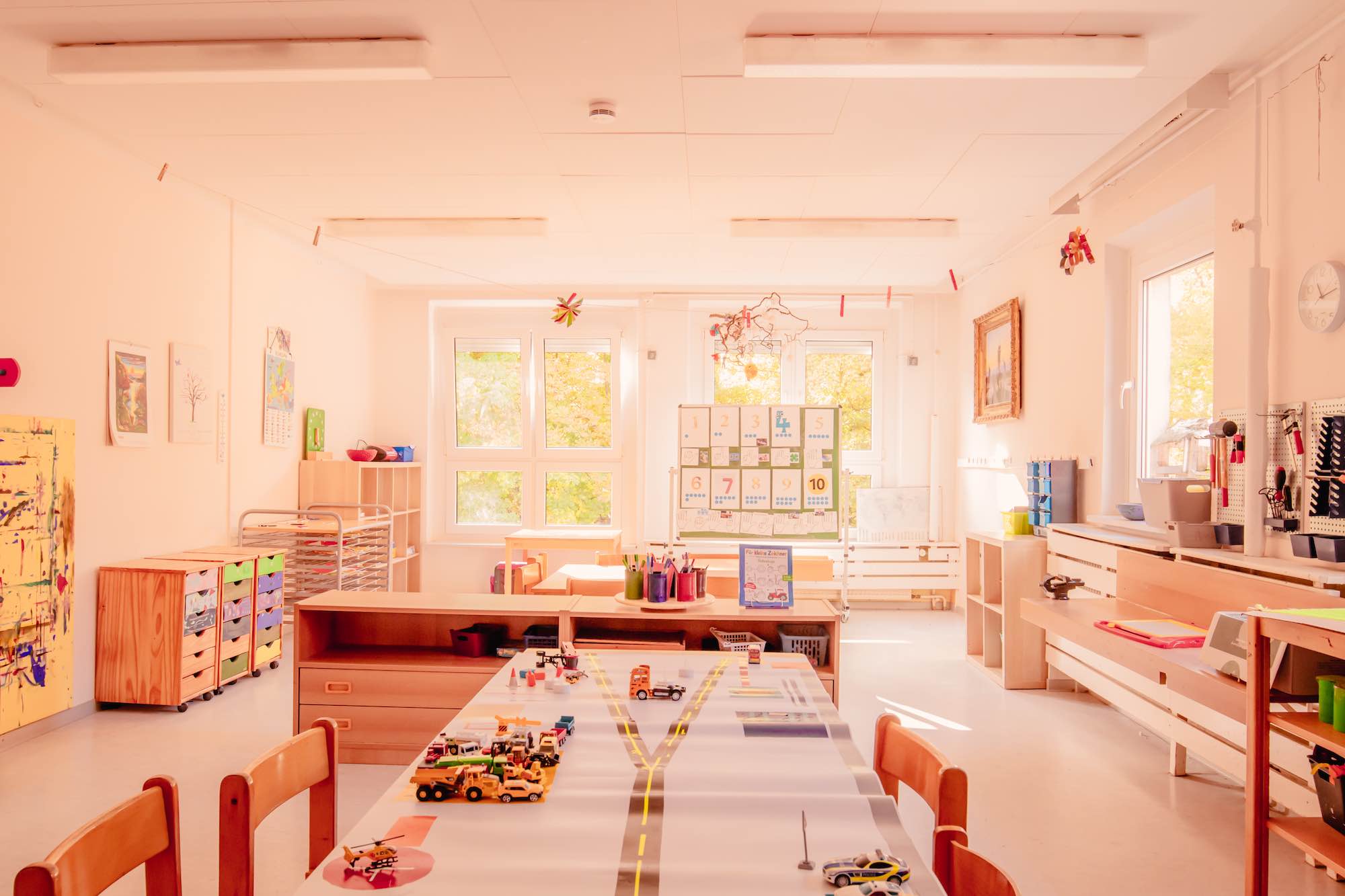 Alle Räume sind mit pädagogisch anspruchsvollen Spiel- und Beschäftigungsmaterialien ausgestattet, die den Kindern in offenen Regalen zur Verfügung stehen.